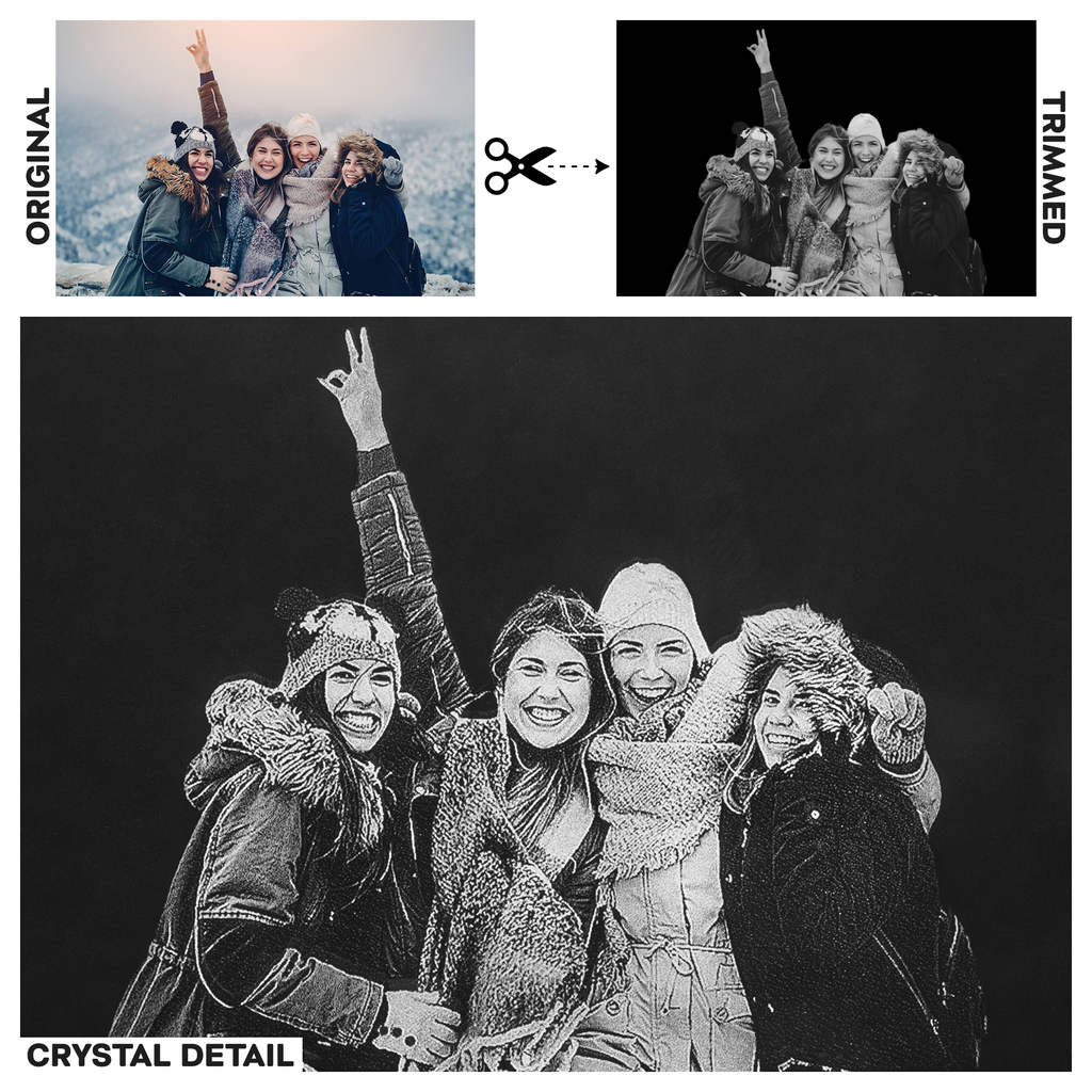 When you upload your image, you will have the ability to scale and position it within the confines of the crystal’s laser area. The background of your image will be removed using state-of-the-art software, making the subject the only portion of your image to be etched into the crystal. Keep this in mind when scaling your image as when the background is removed, you may have more empty space than originally desired.